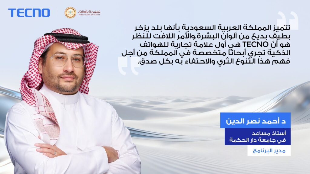 ومن جانبه، أشار البروفيسور أحمد ناصر الدين، الأستاذ المساعد في جامعة دار الحكمة، “المملكة دولة غنية بمجموعة جميلة من ألوان البشرة. وما يثير الدهشة هو أن TECNO هي العلامة التجارية الأولى والوحيدة للهواتف الذكية التي تجري أبحاثاً مخصصة هنا لفهم هذا التنوع الحقيقي والاحتفاء به. ونحن فخورون بالمشاركة في هذه المبادرة الرائدة، التي توفر وجهات نظر محلية تساعد في تشكيل التكنولوجيا التي تمثل سكان المملكة بشكل أصيل.”